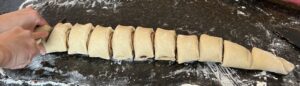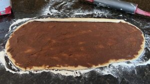 - After dough has risen, roll out dough on floured surface to 24″ x 12″ rectangle and about 1/4″ thick.
