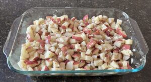 - In large glass baking pan, add potatoes, onions, garlic, olive oil, herbes de provence, pepper.