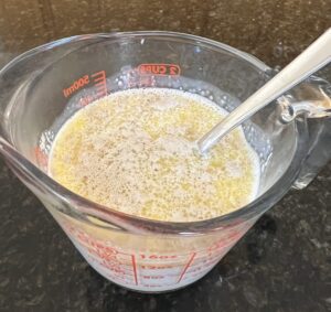 3. In glass measuring cup, heat milk in microwave for 1 min and then add melted butter.