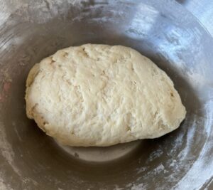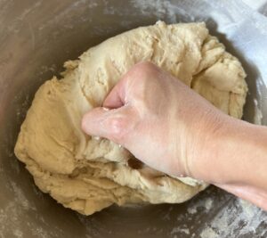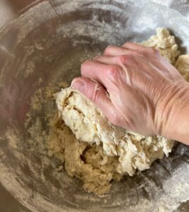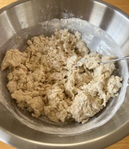 7. When dough has pulled together, knead in bowl or on a flat lightly floured surface for 5-10 minutes.