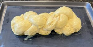 11. Place braided dough on parchment paper on baking sheets and lightly brush with the egg and milk mixture. Let rise 30 minutes.