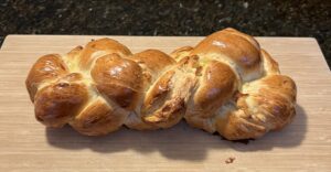 - After dough has risen, cut dough into 2 equal pieces and roll or stretch into two long overlapping strings/snakes that form a plus (+) sign.
